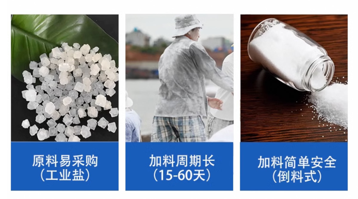 采用负压抽吸出药,结构合理,可靠性强,故障率低,使用寿命长(10年以上)。自动控制,设备运行可与水泵等设备联动启停,,控制方式简单实用。以氯化钠为原料,通过电极和隔膜通直流电后产生二氧化氯水溶液体积小(占地面积0.5-1.2平方米)、重量轻、操作简单、维修方便。