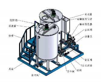 加药装置是以计量泵为主要投加设备,将溶药箱、搅拌器、液位计、安全阀、止回阀、压力表、过滤器、缓冲器、管路、阀门、底座、扶梯、自动监视系统、电力控制系统等按工艺流程需要组装形成一个模块,即所谓的撬装式组合单元。