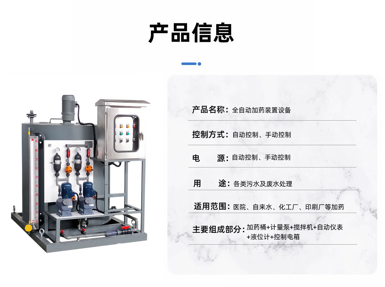 加药装置通过不同的配置,精确配置各类固体和液体的化学药品的溶液,再用计量泵准确投加,以达到各种设计要求。