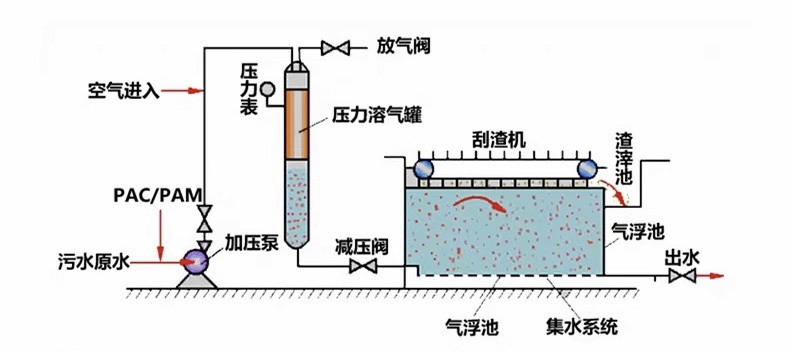 通过溶气和释放系统在水中产生大量的微细气泡,使其粘附于废水中密度与水接近的固体或液体微粒上,造成整体密度小于水的状态,并依靠浮力使其上升至水面,从而达到固液或液液分离的目的。
